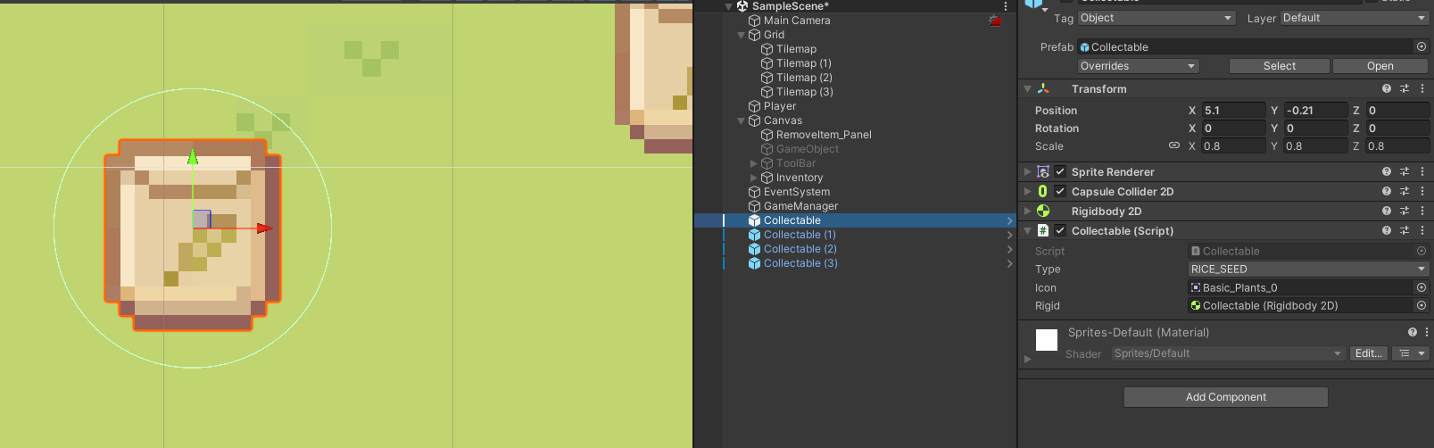 수집 가능한 아이템을 나타내는 스크립트를 작성해서 오브젝트의 타입을 정의하고, 플레이어에 닿으면 해당 오브젝트를 인벤토리에 추가하도록 한다.