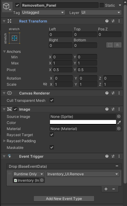 Event Trigger - Drop - Inventory_UI.Remove() 함수를 추가한다.