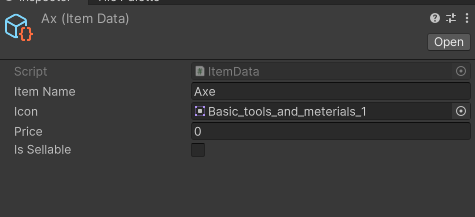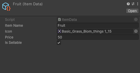 호기, 물뿌리개, 도끼 등 필수적인 아이템을 팔지 못하게하고, 과일, 나무, 식물, 씨앗 등을 팔 수 있도록 분리하기 위해 Item Data에 isSellable을 추가하여 각 아이템에 맞게 설정해주었다.