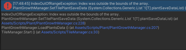 이 오류가 발생한 코드 부분은 SetTilePlantSaveData에서 SetTile을 해주는 부분이었다.