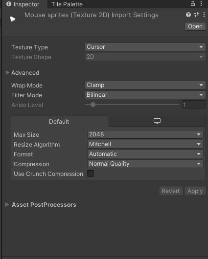 마우스 커서를 변경하기 위해서 마우스 Sprite의 Texture Type을 Cursor로 변경해줘야 한다.
