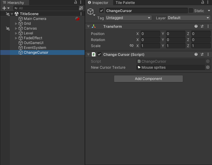 그리고 새로운 게임오브젝트를 생성하여 ChangeCursor 스크립트와 마우스 스프라이트를 추가한다.