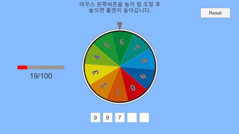 0~9 까지 있는 숫자판을 게이지의 파워만큼 돌려 5개의 로또 번호를 뽑는 룰렛 게임을 만들어보도록 합니다.