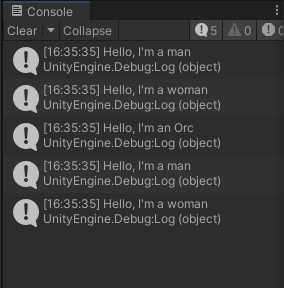 Tavern 클래스를 별개의 스크립트 파일로 선언하여 술집에 있는 NPC들의 배열을 생성한 뒤 파생클래스의 SayGreeting 함수를 호출한다.