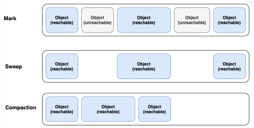 가비지 컬렉션이 될 대상 객체를 식별(Mark)하고 제거(Sweep)하며 객체가 제거되어 파편화된 메모리 영역을 앞에서부터 채워나가는 작업(Compaction)을 수행하게 된다.