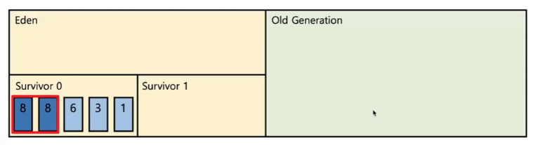 6. 살아남은 모든 객체들은 age 값이 1씩 증가 (*age 값 : Survivor 영역에서 객체가 살아남은 횟수를 의미하는 값)