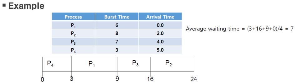 - 평균 대기 시간이 가장 짧다. 하지만 실제로는 실행 시간을 알 수 없어서, 과거의 실행했던 시간을 토대로 추측해야한다.