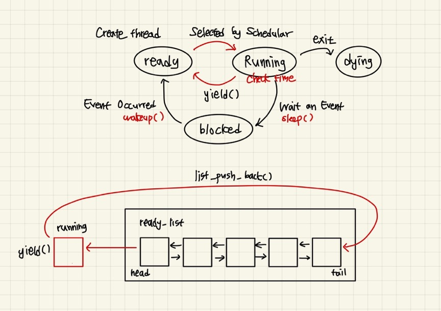 현재 코드는 경과 시간을 확인해서 현재 스레드가 sleep해야 할 tick 시간보다 작을 때까지 while문을 계속 돌면서 cpu를 양보하여 다른 스레드에게 실행 기회를 넘겨주고 있다. -> busy waits