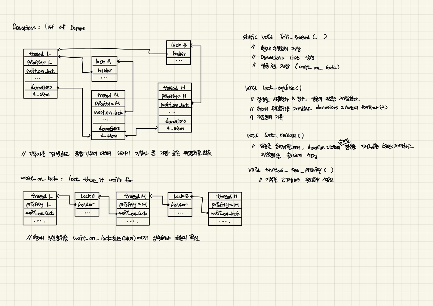 언제까지 기부를 하느냐? wait_on_lock이 없는 스레드까지, 그리고 현재 우선순위보다 클 때 while문을 탈출하도록 구현하려고 했다.