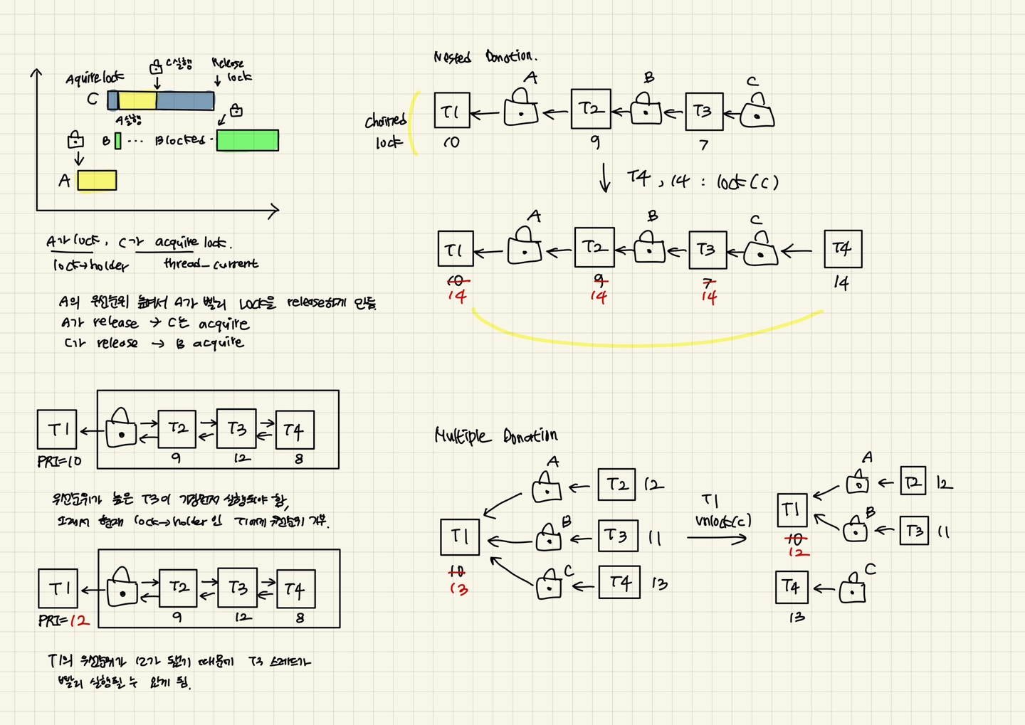nest donation은 현재 스레드의 wait_on_lock->holder를 확인해서 현재 우선순위보다 작으면 계속해서 기부를 해주는데