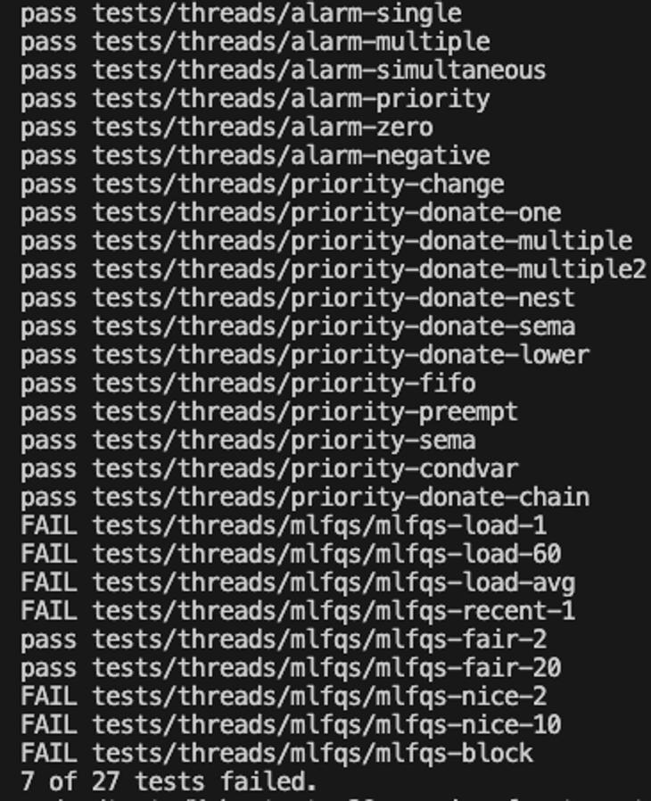 시간 관계상 mlfqs는 못하였는데 그래도 내 손으로 끝까지 alarm과 priority를 해냈다는 뿌듯함이 너무 커서 아쉽지만 기분은 좋다!