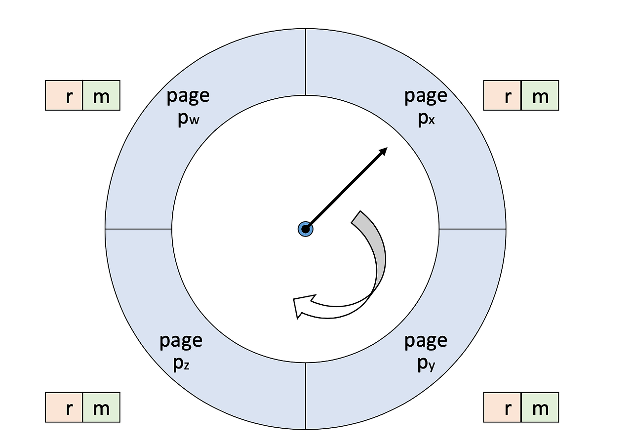 모든 page가 순환 리스트를 이루고 특정 page를 시계바늘 돌듯이 가리킨다고 가정할 때